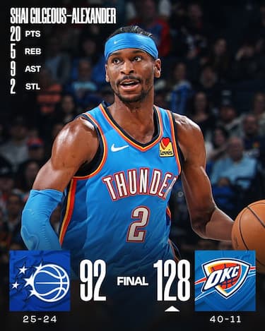 C’è anche la prima tripla doppia nella carriera di Isaiah Hartenstein (12 punti, 10 rimbalzi e 10 assist) nella larghissima vittoria casalinga di Oklahoma City su Orlando. I Thunder fanno il vuoto già nel 1° quarto, nel quale concedono la miseria di 14 punti agli avversari, mentre ai Magic servono davvero a poco i 20 punti con 7/11 dal campo di Jalen Suggs