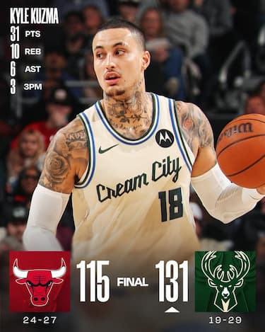Ci vuole un Kyle Kuzma da 31 punti che pareggia il suo season high per regalare ai Bucks la vittoria che spezza il filotto di 5 sconfitte consecutive maturato nelle ultime partite. Milwaukee trova anche la doppia doppia da 21 punti e 10 assist di Ryan Rollins, mentre Chicago ha 22 punti da Matas Buzelis e 21 da Coby White, ma non riesce mai davvero a impensierire i padroni di casa