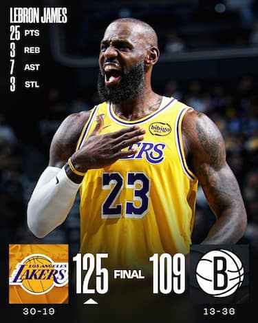 Anche i Lakers, in trasferta a Brooklyn, mettono subito in chiaro le cose in un 1° quarto dominato 43-25 e da lì in poi gestiscono senza problemi grazie alle loro stelle LeBron James (25 punti e 7 assist) e Luka Doncic (24 punti e 6 rimbalzi). Prova opaca dei Nets, tra cui si salva il solo Michael Porter Jr. con la doppia doppia da 21 punti e 10 rimbalzi