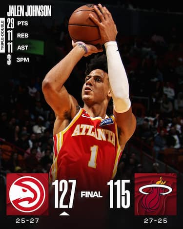 Non basta un ottimo Simone Fontecchio, che parte ancora una volta in quintetto e chiude con 18 punti, 6 rimbalzi, 2 assist e una stoppata in quasi 34 minuti giocati, agli Heat per battere Atlanta. Miami va infatti a sbattere sul muro eretto da Jalen Johnson con la tripla doppia da 29 punti, 11 rimbalzi e 11 assist, a cui si aggiungono i 26 punti in uscita dalla panchina del veterano CJ McCollum