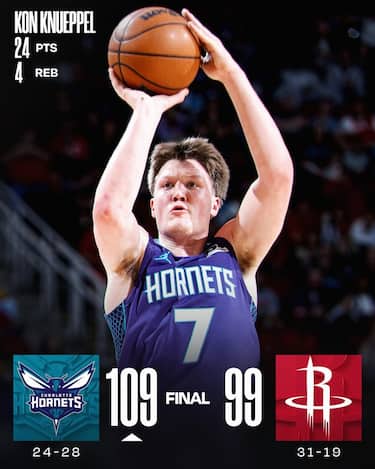 La seconda sorpresa di serata si verifica a Houston, dove gli Hornets, guidati da Kon Knueppel (24 punti) e LaMelo Ball (20), trovano la loro 8^ vittoria consecutiva, facendo così segnare la striscia vincente più lunga nella storia della franchigia dietro solo a quella da 9 che risale alla stagione 1998-99. Ai Rockets, invece, non bastano i 31 punti del solito Kevin Durant, unico insieme a Jabari Smith Jr. (17) ad andare in doppia cifra per i padroni di casa