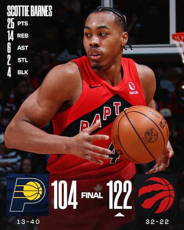 Basta un’accelerata nel 3° quarto, in cui il vantaggio veleggia ben oltre i 20 punti, ai Raptors per passare contro Indiana. Scottie Barnes va in doppia doppia con 25 punti e 14 rimbalzi, RJ Barrett aggiunge 20 punti e 8 rimbalzi e per Toronto tutto fila liscio. Ai Pacers servono invece a poco i 18 punti dell’All-Star Pascal Siakam