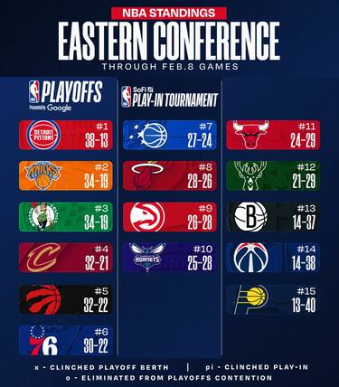 New York vince lo scontro diretto con Boston e si riprende il secondo posto in classifica, mentre Toronto difende il quinto dalla risalita di Philadelphia. Miami è a mezza gara di distanza dal settimo di Orlando, Washington e Indiana sempre ultime