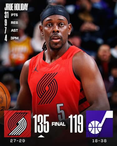 Il migliore in campo a Salt Lake City è un ragazzo di 35 anni con 16 stagioni in NBA e 2 titoli alle spalle, che a quanto pare non ha ancora esaurito le energie necessarie per giocare nella lega. Contro i Jazz, Jrue Holiday guida i Blazers con 31 punti, 9 rimbalzi e 7 assist in una partita in cui tira con un eccellente 10/15 complessivo