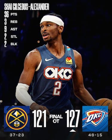 In quella che secondo molti è un possibile anticipo della finale della Western Conference sono i Thunder ad avere la meglio dopo un’autentica battaglia che si estende ad un tempo supplementare. Alex Caruso (12 punti) avrebbe l’occasione di vincerla per Oklahoma City sull’ultimo possesso dei regolamentari, ma il suo tiro non va e all’overtime sono comunque i padroni ad avere la meglio. Rientro in grande stile per Shai Gilgeous-Alexander, che chiude con 36 punti e 9 assist pur rimanendo in panchina nell’overtime, mentre a Denver non bastano i 39 punti di Jamal Murray e la tripla doppia di Nikola Jokic (23 punti, 17 rimbalzi e 14 assist)