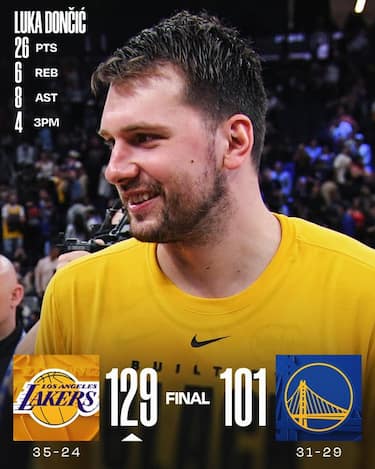 Luka Doncic festeggia il suo 27° compleanno in campo, regalandosi una prestazione da 26 punti, 6 rimbalzi e 8 assist in una gara mai in discussione sul campo di Golden State, toccando anche il +32 nel corso del match. LeBron James segna 20 dei suoi 22 punti nel solo primo tempo e Austin Reaves ne aggiunge 18 per tornare alla vittoria dopo tre sconfitte in fila, mentre gli Warriors non vanno oltre i 14 punti di Gui Santos (appena confermato con un contratto triennale) pagando le assenze di Curry e Porzingis