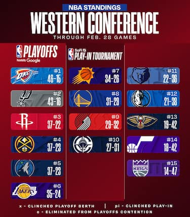Houston vede assottigliarsi il proprio vantaggio nei confronti di Denver e Minnesota, distanti ora mezza partita, e dei Lakers a due gare di distanza. Golden State nonostante la sconfitta rimane fissa all’ottavo posto, New Orleans scavalca Utah per salire in 13^ posizione
