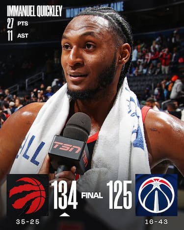 Sono i 27 punti con 11 assist di Immanuel Quickley a spingere Toronto al successo, rimontando da -13 nel corso del primo tempo per controllare la seconda metà di gara e tornare alla vittoria dopo i ko con OKC e San Antonio. Chiudono in doppia cifra anche gli altri membri del quintetto dei Raptors (Ingram 24, Barrett 21, Barnes 18, Poeltl 18+10) per compensare i soli 26 punti prodotti dalla panchina e rendere inutili i 19 di Will Riley, che non evita a Washington la quarta sconfitta consecutiva