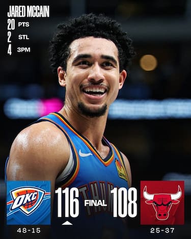 Senza Shai Gilgeous-Alexander, ancora alle prese con il problema agli addominali che lo ha tenuto fuori per 9 partite, i Thunder non hanno problemi a vincere a Chicago, godendosi un Jared McCain da 20 punti accompagnato dai 19 di Isaiah Joe. I Bulls danno battaglia nell’ultimo quarto tornando fino al -6 dopo essere stati sotto anche di 19 nel corso del match, ma né i 20 di Collin Sexton né i 18 (massimo in stagione) con 12 rimbalzi di Guerschon Yabusele evitano la 12^ sconfitta nelle ultime 13