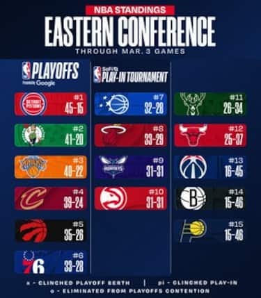 Nonostante la sconfitta Detroit mantiene 4.5 gare di vantaggio su Boston, mentre New York si trova esattamente a metà tra i Celtics e i Cavaliers. Orlando e Miami si riavvicinano al sesto posto di Philadelphia, così come Charlotte risponde ai quattro successi in fila di Atlanta