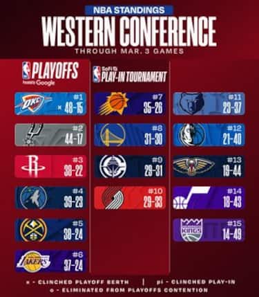 OKC è già sicura di un posto in post-season anche perdendole tutte da qui alla fine, mantenendo sei gare di vantaggio su San Antonio. Houston e Minnesota sono separate solo da pochi decimi di percentuale di vittorie, mentre i Lakers provano a non perdere la scia per il fattore campo ai playoff