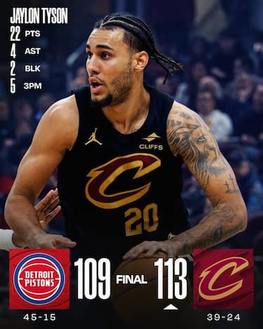 Anche senza Donovan Mitchell, i Cavs vendicano la recente sconfitta subita a Detroit battendo i Pistons per la seconda volta in stagione, guidati dai 22 punti di Jaylon Tyson e i 18 di James Harden e Evan Mobley. I Cavs resistono al tentativo di rimonta dei Pistons da -11 a -1 nel quarto periodo, spinti dai 24 punti con 14 rimbalzi di Jalen Duren, ma Detroit paga la brutta serata al tiro di Cade Cunningham (10 punti con 4/16 dal campo, pur con 14 assist) e vede interrompersi la sua striscia di sei vittorie in fila in trasferta