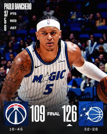 È un Paolo Banchero scintillante da 37 punti (massimo stagionale) a guidare i Magic al successo sugli Wizards, andando anche avanti di 25 lunghezze nonostante le assenze di Anthony Black, Wendell Carter Jr e Franz Wagner. Washington però si presenta con soli nove giocatori a disposizione e non va oltre i 19 punti di Will Riley e i 18 di Jaden Hardy, con la giocatrice WNBA Angel Reese a bordocampo per tifare il fratello Juju, autore di 9 punti e 8 rimbalzi alla sua seconda partenza in quintetto in carriera