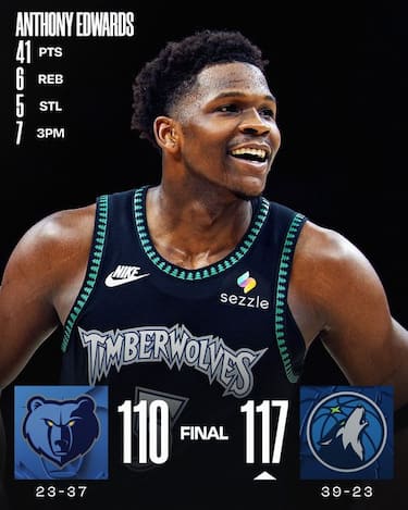 La quarta vittoria consecutiva dei T’Wolves porta la firma di Anthony Edwards, che dopo un primo tempo complicato si scatena nella ripresa realizzando 41 punti e tutte le giocate decisive nel finale. Julius Randle aggiunge 23 punti e 11 rimbalzi mentre gli sforzi dei vari Jaylen Wells (19 punti) e Cedric Coward (15) non bastano ai Grizzlies per completare una rimonta partita da -17, pagando la differenza a rimbalzo (51-33 per Minnesota)