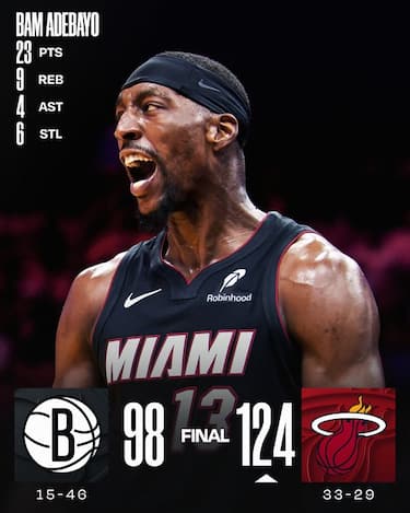 Nessun problema per gli Heat nella prima di due gare consecutive contro i Nets. Bam Adebayo ne segna 23, Tyler Herro 22 e Jaime Jaquez 20 per conquistare la quinta vittoria nelle ultime sette partite, toccando il massimo vantaggio sul +27. I 17 di Noah Clowney e i 16 di Ziaire Williams non evitano la nona sconfitta consecutiva di Brooklyn, anche perché Michael Porter Jr. tira malissimo (3/17) e chiude con 9 punti. Sono 12 invece quelli di Simone Fontecchio con 3/6 da tre punti e 3/3 ai liberi, insieme a 3 rimbalzi, 1 assist e 1 recupero in 20 minuti