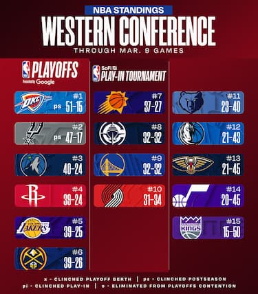OKC mantiene tre gare di vantaggio su San Antonio per il primo posto, mentre Denver è tanto vicina al terzo posto di Minnesota quanto al settimo di Phoenix (1.5 gare di distanza ciascuna). I Clippers superano Golden State all’ottavo posto, nelle retrovie vincono tutte tranne Memphis e Dallas (7 ko in fila)