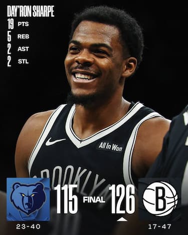 Secondo successo consecutivo per i Nets, che ringraziano i 19 punti di Day’Ron Sharpe (massimo stagionale pareggiato) e i 18 di Ochai Agbaji per superare i Grizzlies in una serata in cui Michael Porter Jr viene tenuto a riposo. Anche Memphis si presenta con soli otto giocatori a disposizione, venendo guidata dai 20 di Rayan Rupert (massimo in carriera) e i 19 di Javon Small, che però non evitano l’11^ sconfitta nelle ultime 14