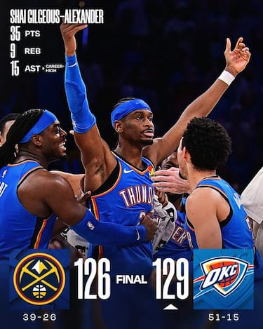 Il big match della notte si risolve solo nelle battute finali, quando Shai Gilgeous-Alexander segna una tripla step back a 2.7 secondi dalla fine per spezzare la parità e regalare l’ennesima vittoria sui Nuggets ai suoi Thunder. L’MVP in carica suggella così una serata da 35 punti, 9 rimbalzi e 15 assist con zero palle perse e un record storico, raggiungendo le 126 gare consecutive da almeno 20 punti di Wilt Chamberlain. Nikola Jokic le prova tutte per tenere in partita i suoi realizzando una tripla doppia da 32 punti, 14 rimbalzi e 13 assist insieme ai 28 di Tim Hardaway Jr e i 23+10 di Aaron Gordon, ma Denver deve arrendersi per la terza volta su tre in stagione contro i Thunder nonostante le assenze di Caruso, Holmgren, Hartenstein e Jalen Williams tra i padroni di casa