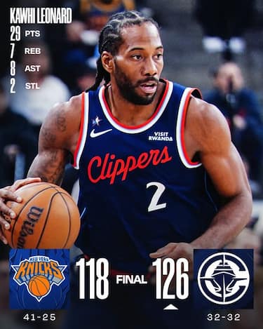 Dopo aver perso 21 delle prime 27 partite, i Clippers completano la loro scalata e tornano a un record del 50% per la prima volta da inizio novembre, superando i Knicks grazie ai 29 punti di Kawhi Leonard, i 28 di Bennedict Mathurin (di cui 22 solo nella ripresa) e i 23 di Darius Garland. Per New York, nonostante il pubblico a proprio favore presente all’Intuit Dome, non bastano i 35 punti con 12 rimbalzi di Karl-Anthony Towns e i 28 di Jalen Brunson, perdendo la terza delle ultime quattro partite