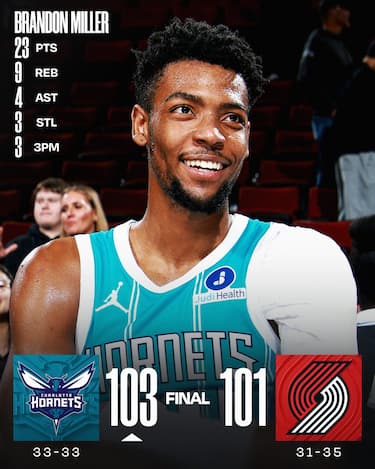 A Portland gli Hornets vanno sotto anche di 19 punti, ma trascinati da Brandon Miller (23 punti e 9 rimbalzi)riescono a rimontare e a strappare in volata un successo che li riporta al 50% di vittorie in classifica. I Blazers partono molto bene, hanno 24 punti dal veterano Jerami Grant ma poi calano vistosamente nelle fasi decisive della partita