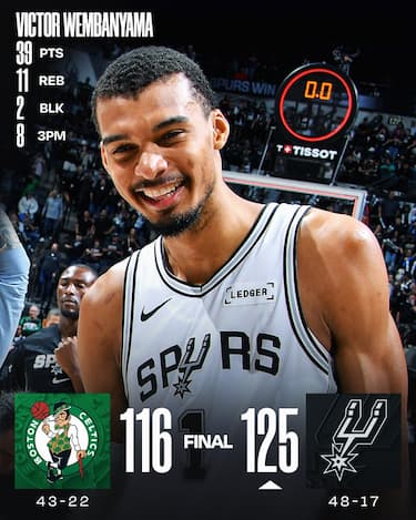 Anche i lanciatissimi Celtics, che hanno 34 punti dall’ex di serata Derrick White e 24 da un Jayson Tatum sempre più a suo agio dopo il ritorno dall’infortunio, si devono arrendere a Victor Wembanyama, che quasi da solo travolge Bostoncon 39 punti, 11 rimbalzi e ben 8 triple segnate, massimo in carriera per il fenomeno francese