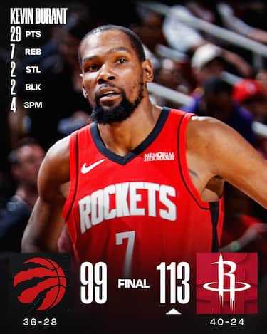 Sono Kevin Durant, migliore in campo con 29 punti, e Jabari Smith Jr. e Amen Thompson, autori di 23 punti a testa, a trascinare Houston alla vittoria su Toronto, che arriva soprattutto grazie ad un eccellente 4° quarto dei padroni di casa. RJ Barrett e Scottie Barnes rispondono con 25 e 24 punti, ma i Raptors si bloccano in attacco nella fase finale della gara
