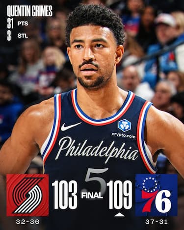 È Quentin Grimes, autore di una prova da 31 punti di cui 14 nel decisivo 4° quarto, a trascinare Philadelphia alla vittoria su Portland nonostante le molte assenze per infortunio. I Sixers hanno anche la doppia doppia da 18 punti e 12 rimbalzi di VJ Edgecombe, mentre Denni Avdija chiude con 25 punti, 9 assist e 6 rimbalzi ma i Blazers non riescono a tenere il ritmo degli avversari nella seconda metà di gara