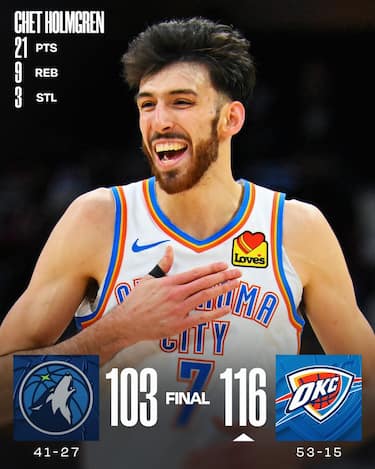 L’ottava vittoria consecutiva di Oklahoma City arriva trovando il giusto ritmo dalla metà del 3° quarto in poi, cancellando il vantaggio di 9 lunghezze accumulato fino a quel momento da Minnesota guidata dai 32 di Julius Randle e i 19 di Anthony Edwards. La difesa di OKC forza 22 palle perse agli avversari e capitalizza dall’altra parte realizzando 29 punti (contro i soli 6 dei T’Wolves sui 7 turnover dei Thunder), ringraziando l’energia dalla panchina dei vari Isaiah Joe (20 punti), Alex Caruso (17) e Jared McCain (15). Shai Gilgeous-Alexander ha bisogno di 10 punti nel 4°periodo per raggiungere quota 20 e tenere aperta la striscia, aggiungendo anche 10 assist in una serata da 7/22 al tiro