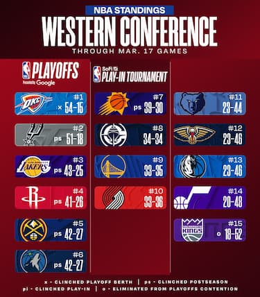 OKC è aritmeticamente sicura di uno dei primi sei posti, mentre Houston, Denver e Minnesota hanno ora tutte tre gare di vantaggio su Phoenix per evitare il torneo play-in