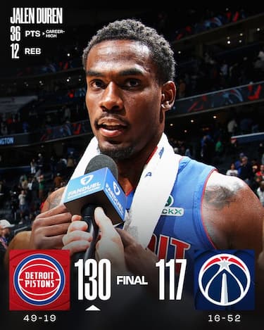 Quarta vittoria nelle ultime cinque per i Pistons, che riescono a superare Washington pur perdendo Cade Cunningham a metà primo quarto per dolori alla schiena dopo essersi buttato su un pallone vagante. La sua riserva Daniss Jenkins segna 15 punti e soprattutto l’altro All-Star Jalen Duren ne fa 36 con 12 rimbalzi, infliggendo a Washington la 13^ sconfitta in fila nonostante i 30 di Bub Carrington (massimo stagionale)