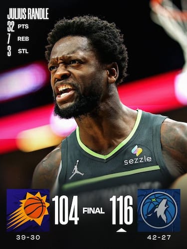 Successo importante per i T’Wolves, che senza Anthony Edwards (fuori per 1-2 settimane per una infiammazione al ginocchio) battono i Suns e li tengono a distanza per uno dei primi sei posti a Ovest. Julius Randle firma la sua seconda gara consecutiva da 32 punti e Bones Hyland con 22 dalla panchina è importane per ribaltare il -11 a cui erano finiti i padroni di casa nel primo quarto, complice un Devin Booker da 34 punti per sopperire alle assenze di Dillon Brooks, Grayson Allen e Mark Williams, ma senza evitare la terza sconfitta in fila