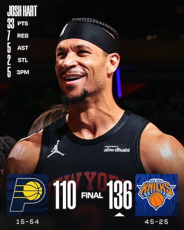 La quarta vittoria consecutiva dei Knicks porta la firma di Josh Hart, autore del suo massimo stagionale da 33 punti con un pressoché perfetto 12/13 al tiro, seguito dai 26 di OG Anunoby e i 22 di Karl-Anthony Towns. Sono invece 14 le sconfitte consecutive dei Pacers, che crollano a inizio quarto periodo e non vanno oltre i 16 punti di Jerace Walker