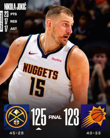 Come se non bastasse aver realizzato una tripla doppia da 23 punti, 17 rimbalzi e 17 assist, Nikola Jokic aggiunge anche il canestro del sorpasso a 11.5 secondi dalla fine per guidare Denver al successo insieme ai 21 di Jamal Murray e i 18 di Tim Hardaway Jr. Devin Booker con 22 punti e 8 assist è l’anima della rimonta dei Suns, ma la sua tripla per vincere la partita prende solo il ferro e condanna Phoenix alla sesta sconfitta nelle ultime sette
