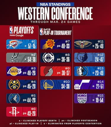 Denver mantiene il quarto posto e la pressione sui Lakers, davanti solo di 1.5 partite. Phoenix è ormai certa del settimo posto, mentre New Orleans non può più rientrare in zona play-in. Sacramento sempre ultima nella conference