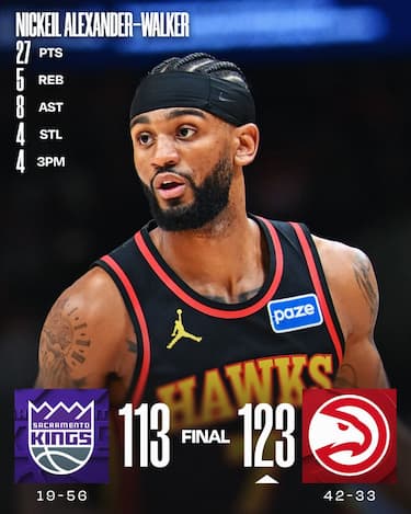 In casa contro i Kings Atlanta va avanti in doppia cifra ma si fa recuperare nel 4° quarto, quindi serve un parziale di 26-16 con cui gli Hawks chiudono la partita per vincere la 15^ partita nelle ultime 17 disputate. Nickeil Alexander-Walker guida i suoi con 27 punti e 8 assist, mentre Jalen Johnson fa registrare la 44^ doppia doppia della sua stagione con 26 punti e 10 assist. A Sacramento, invece, i 22 punti del veterano DeMar DeRozan servono solo a creare l’illusione del colpo in trasferta in rimonta