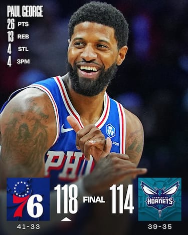 Sono i big three Joel Embiid (29 punti), Tyrese Maxey (26 punti e 8 assist) e Paul George (26 punti e 13 rimbalzi) a trascinare i Sixers alla rimonta dal -13 nel secondo tempo e quindi alla preziosissima vittoria, la 4^ nelle loro ultime 5 partite, in casa degli Hornets. Charlotte trova 29 punti e 8 rimbalzi da Brandon Miller e 16 punti in uscita dalla panchina da Coby White, ma l’attacco dei ragazzi di coach Charles Lee si ferma nel 4°quarto, dove arrivano solo 17 punti