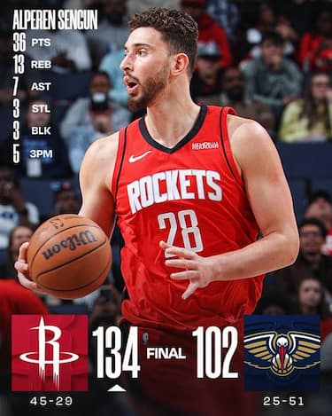 È Alperen Sengun a prendersi i riflettori con una doppia doppia da 36 punti e 13 rimbalzi a cui aggiunge anche 7 assist, guidando i suoi al largo successo in Louisiana grazie soprattutto a un secondo quarto da 39-18, toccando anche il +33 per riprendersi il quinto posto a Ovest. Kevin Durant e Jabari Smith Jr aggiungono 20 punti a testa, mentre i padroni di casa non vanno oltre i 19 di Dejounte Murray e i 18 di Saddiq Bey e Zion Williamson subendo l’11^ sconfitta nelle ultime 12