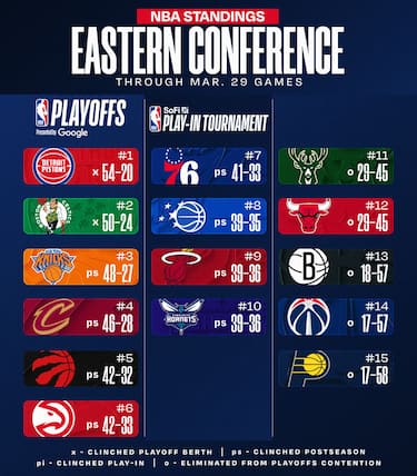 Boston si assicura i playoff senza dover passare dal play-in, e allunga al secondo posto su New York. Toronto mette una gara piena di vantaggio sulla zona play-in, e Philadelphia ringrazia le sconfitte di Orlando, Miami e Charlotte per essere più salda in settima posizione. Indiana raggiunge Washington a 17 successi, uno in meno di Brooklyn
