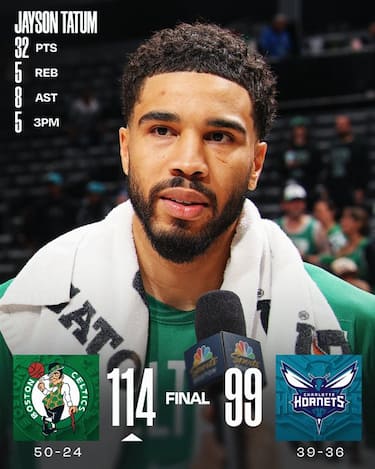 I Celtics si assicurano un posto ai playoff andando a vincere a Charlotte e infliggendo agli Hornets il secondo ko in fila nel weekend. Anche senza Jaylen Brown, è il miglior Jayson Tatum della stagione (32 punti e 8 assist) a caricarsi la squadra sulle spalle insieme ai 28 di Payton Pritchard, con la difesa che tiene gli avversari solamente a 12/43 dall’arco — senza permettere a nessuno di superare quota 20, con LaMelo Ball a 19 e Miles Bridges a 14