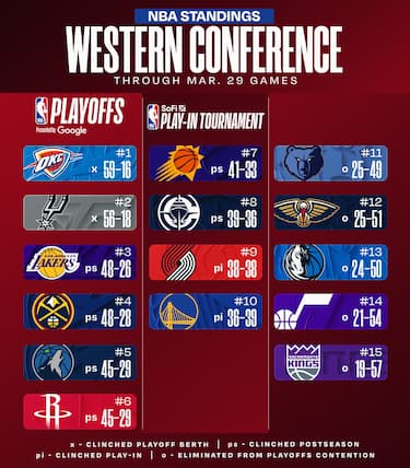 OKC ha sempre 2.5 gare di vantaggio su San Antonio, mentre i Lakers hanno sempre il fiato sul collo di Denver a una gara di distanza per il terzo. Houston e Minnesota hanno lo stesso record in quinta posizione, mentre i Clippers provano a mantenere l’ottava piazza dalla risalita di Portland