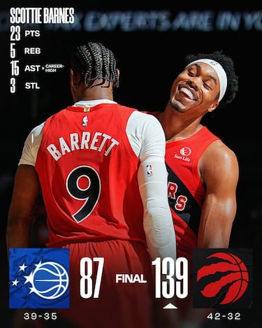 La notizia della notte è il maxi parziale da 31-0 con cui i Raptors schiantano i Magic: dal 1997 (cioè da quando viene conteggiato il play-by-play) non si era mai visto un parziale del genere in NBA, arrivando anche a toccare il +56 nel corso del match. RJ Barrett è il top scorer con 24 punti mentre Scottie Barnes ne mette 23 con 15 assist (career high), infliggendo a Orlando la settima sconfitta nelle ultime otto in una gara mai in discussione sin dal primo quarto (38-20 per i Raptors) nel quale è cominciato il maxi parziale partito da 5:30 dalla fine del primo a 9:42 dalla fine del secondo quarto