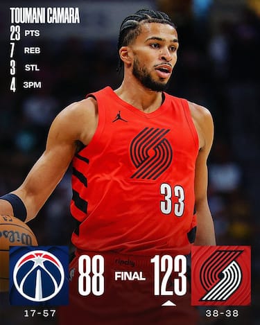 Tutto facile per i Blazers, che non si distraggono in casa contro Washington e vincono la sesta partita delle ultime otto toccando anche il +39 nel corso del secondo tempo, vincendo tutti i quattro quarti. Toumani Camara è il migliore dei suoi con 23 punti seguito dai 21 di Scoot Henderson e i 20 di Deni Avdija, mentre Washington manda cinque giocatori in doppia cifra ma nessuno sopra i 14 di Will Riley in una serata da 37% dal campo di squadra e 15 palle perse
