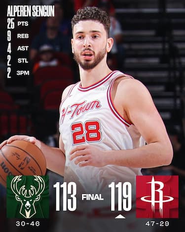 Vittoria meno semplice del previsto per i Rockets, che contro Milwaukee vanno avanti in doppia cifra ma rischiano di farsi rimontare nel finale. Houston ha 27 punti con 9 triple segnate, massimo in carriera, da Reed Sheppard, e 25 punti e 9 rimbalzi da Alperen Sengun, ma stacca la spina troppo presto e Ousmane Dieng, in grande serata con il career high da 36 punti a cui aggiunge 10 assist e 7 rimbalzi, sfiora quasi l’impresa per i Bucks