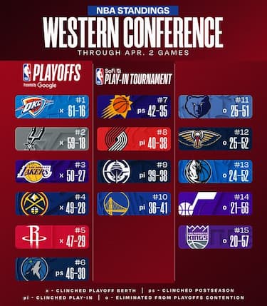 Vittorie per Thunder e Spurs, che proseguono nel loro sprint per la vetta della Western Conference, mentre dietro perdono sia Lakers che Timberwolves, impegnate nella lotta per il miglior piazzamento possibile in zona playoff, dove anche Houston ottiene la qualificazione matematica