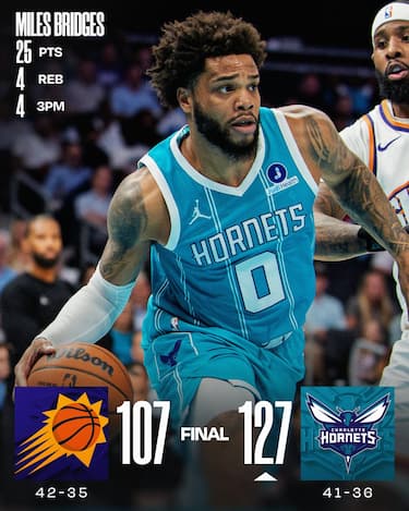 A Charlotte sono i Suns, guidati dai 25 punti e 7 assist di Jalen Green, a partire meglio, ma i padroni di casa si riprendono già nel 2° quarto e grazie alle prestazioni di Miles Bridges (25 punti) e Kon Knueppel (20) cambiano marcia guidando senza grandi problemi fino alla fine e confermando la loro candidatura ad outsider nella post-season della Eastern Conference