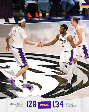 Senza Luka Doncic e Austin Reaves, a Dallas i Lakers trovano un LeBron James in versione vintage che sfiora la tripla doppia con 30 punti, 15 assist e 9 rimbalzi, ma dall’altra parte Cooper Flagg, dopo il career high da 51 puntifatto registrare contro Orlando due sere prima, ne mette 45 sfiorando a sua volta la tripla doppia con 9 assist e 8 rimbalzie trascina i Mavs alla vittoria