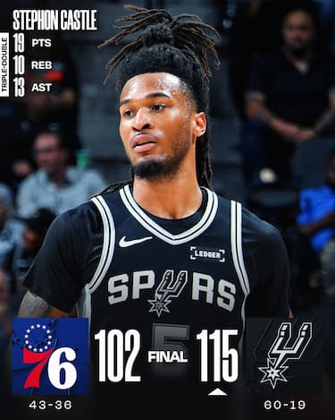Gli Spurs perdono Victor Wembanyama, colpito da un colpo al fianco involontario di Paul George, poco prima dell’intervallo lungo, ma battono comunque nettamente Philadelphia grazie alla tripla doppia da 19 punti, 13 assist e 10 rimbalzi di Stephon Castle e ai 17 punti in uscita dalla panchina di Dylan Harper. Per i Sixers la buona notizia consiste nelle condizioni fisiche di Joel Embiid, che gioca 39 minuti e chiude con 34 punti e 12 rimbalzi