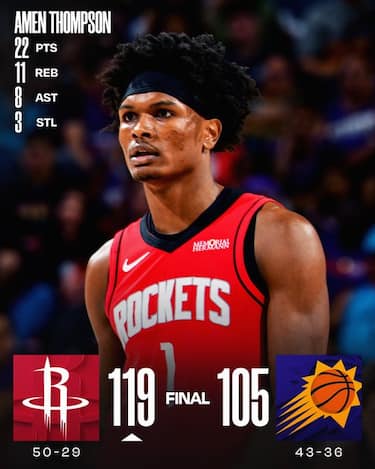 Settima vittoria consecutiva per i Rockets, che agganciano i Lakers in classifica e provano ad assicurarsi il fattore campo al primo turno dei playoff. Al suo primo ritorno da avversario a Phoenix, Kevin Durant segna 24 punti per guidare un quintetto tutto in doppia cifra in cui anche Amen Thompson (22 punti, 11 rimbalzi e 8 assist) e Jabari Smith Jr (20) gli danno man forte, dando lo strappo decisivo in un ultimo quarto da 38-21. Anche i Suns mandano tutti i titolari in doppia cifra con 31 punti e 8 assist di Devin Booker, ma con questa sconfitta sono sicuri di dover passare dal torneo play-in per assicurarsi i playoff