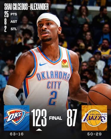 Già privi di Doncic e Reaves, i Lakers tengono a riposo anche LeBron James per un problema al piede e di fatto alzano bandiera bianca prima di cominciare, subendo un parziale di 23-5 nel secondo quarto e finendo sotto anche di 41 punti contro i campioni in carica. Shai Gilgeous-Alexander segna 25 punti guidando i suoi alla sesta vittoria consecutiva (18^ nelle ultime 19) per avvicinarsi ancora di più al miglior record NBA, mentre per i gialloviola sono tre le sconfitte in fila nonostante i 15 di Rui Hachimura