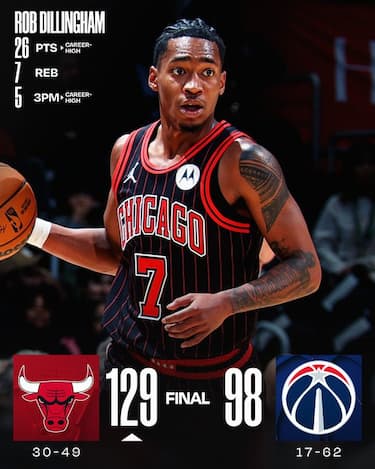 I Bulls tornano a vincere dopo sette sconfitte consecutive, approfittando dell’incrocio con la peggior squadra di questa stagione. Rob Dillingham segna 26 punti (massimo in carriera) e Patrick Williams aggiunge il suo massimo stagionale da 20 punti insieme agli stessi di Tre Jones alla prima partita dopo il licenziamento del front office, mentre gli Wizards perdono la 23^ delle ultime 24 partite assicurandosi di tenere la propria scelta al Draft (era protetta 8, altrimenti sarebbe finita a New York)